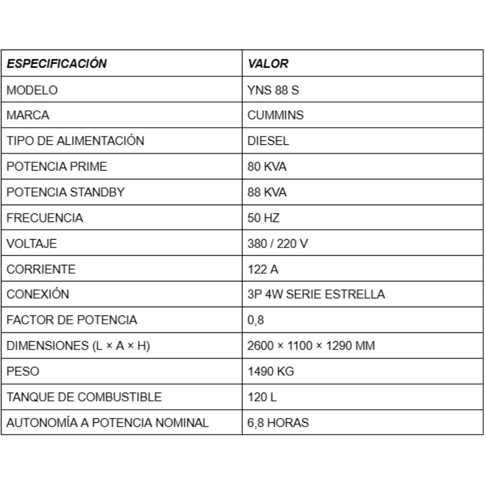 El Grupo Electrógeno Cummins YNS88 S 80 kVA Silent Diesel está diseñado para proporcionar energía confiable y continua en aplicaciones industriales, comerciales e institucionales de alta demanda. Ofrece una potencia prime de 80 kVA (64 kW) y una potencia standby de 88 kVA (70,4 kW), operando a 50 Hz con tensión trifásica 380/220 V, conexión 3P 4W en serie estrella y factor de potencia 0,8, lo que lo convierte en una solución eficiente tanto para respaldo ante cortes de red como para funcionamiento prolongado.
