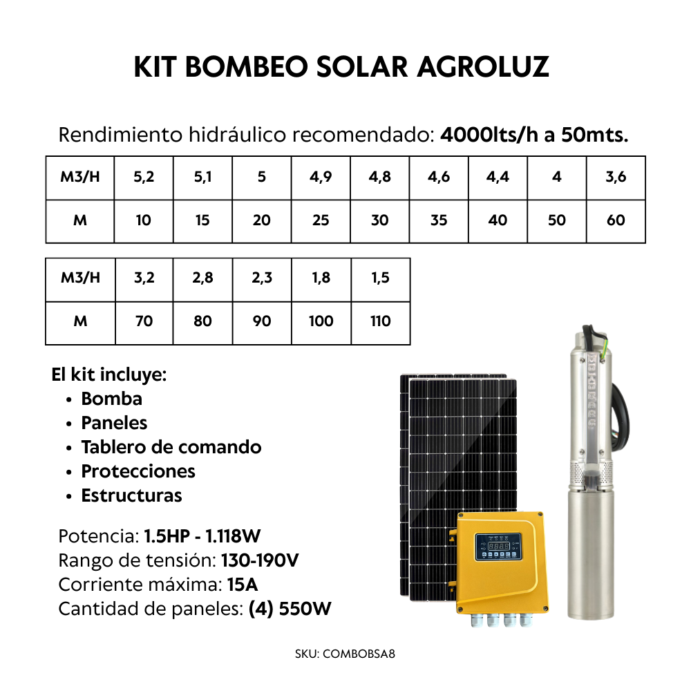 Sistema diseñado para alcanzar un rendimiento hidráulico recomendado de 4.000 litros por hora a 50 metros de altura, con un caudal diario estimado de hasta 20.000 litros, dependiendo de las condiciones de radiación solar y la instalación.
