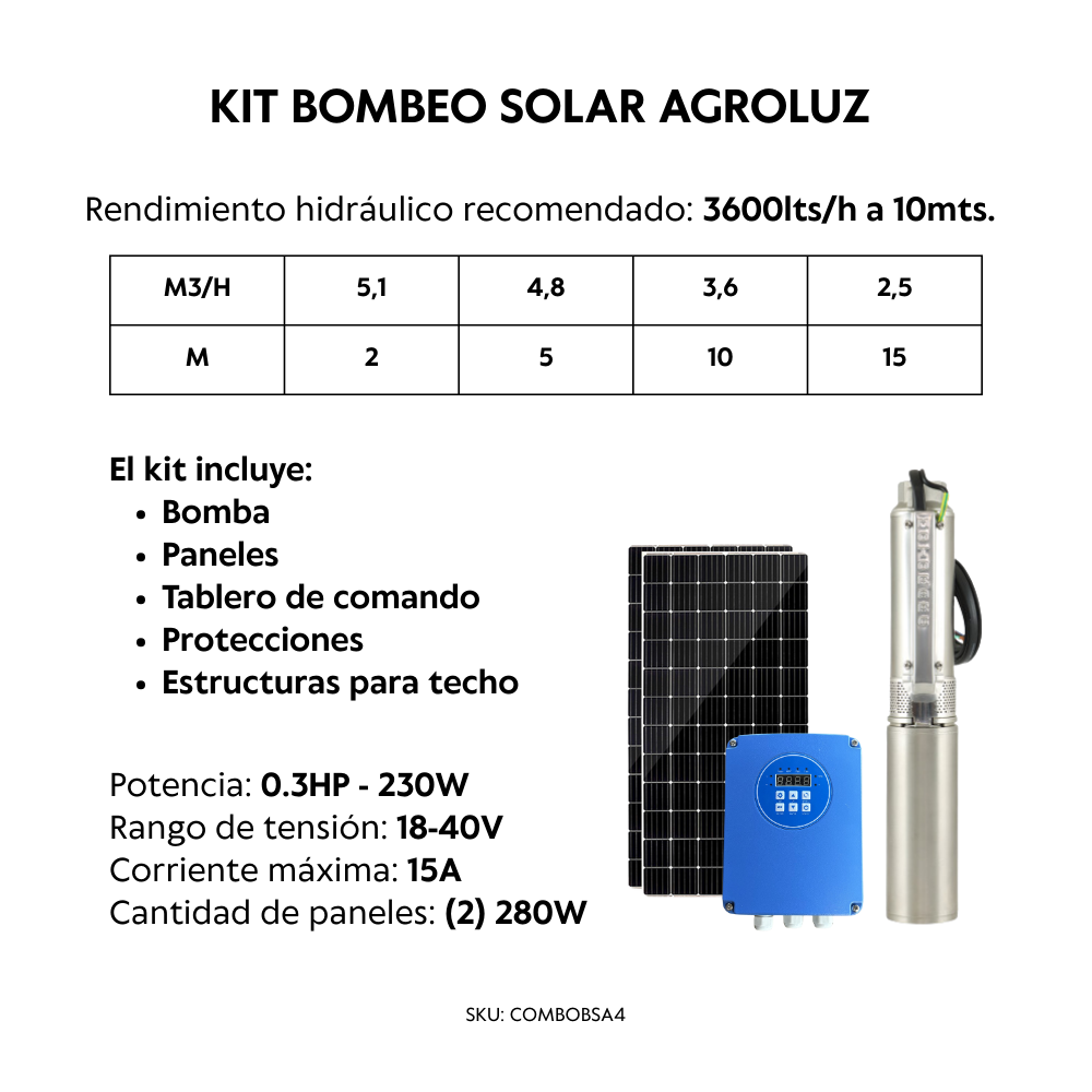 Sistema diseñado para alcanzar un rendimiento hidráulico recomendado de 3.600 litros por hora a 10 metros de altura, con un caudal diario estimado de hasta 18.000 litros, dependiendo de las condiciones de radiación solar y la instalación.