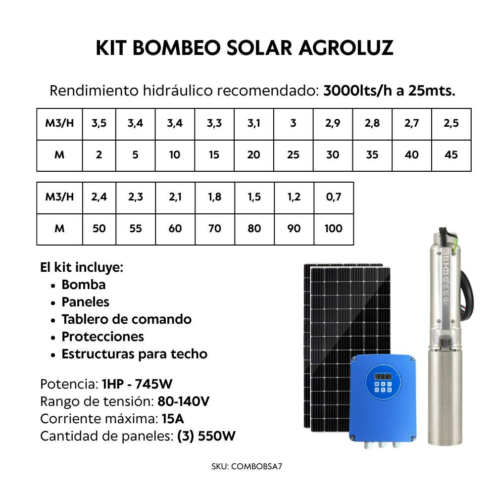 Sistema diseñado para alcanzar un rendimiento hidráulico recomendado de 3.000 litros por hora a 25 metros de altura, con un caudal diario estimado de hasta 15.000 litros, dependiendo de las condiciones de radiación solar y la instalación.
